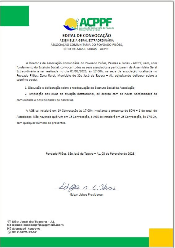 A Diretoria da Associação Comunitária do Povoado Pilões, Palmas e Farias - ACPPF, vem, com fundamento do Estatuto Social, convocar todos os seus associados a participarem da Assembleia Geral Extraordinária a ser realizada no dia 01/03/2025, às 17:00h, na sede da associação localizada no Povoado Pilões, Zona Rural, Município de São José da Tapera – AL, objetivando deliberar sobre a seguinte pauta: